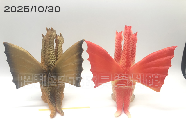 今回ガイガンのサンプル?と言うお品も見かけましたが、元の販売品が同じ蓄光ソフビなので色違いだけであればサンプルかどうかさえ分からないので購入しませんでした。それでも3万円以上で販売されています。こちらは羽の部分が抜かれていない状態でもあったので、資料としてはまぁ合格かと思い購入しました。
